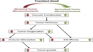 The effects of combined Tranilast-Doxil NF were more effective than all the other five treated groups. The results are summarized in Figure 9, showing the normalization of the TME of TNBC.2 There is an increased function of the blood vessels including more blood flow and therefore, more oxygenation. There is also an increased immune system response and efficiency of immune checkpoint blockades (ICB).2,10 All these positive factors combined change the TME and decrease the growth of the tumor.