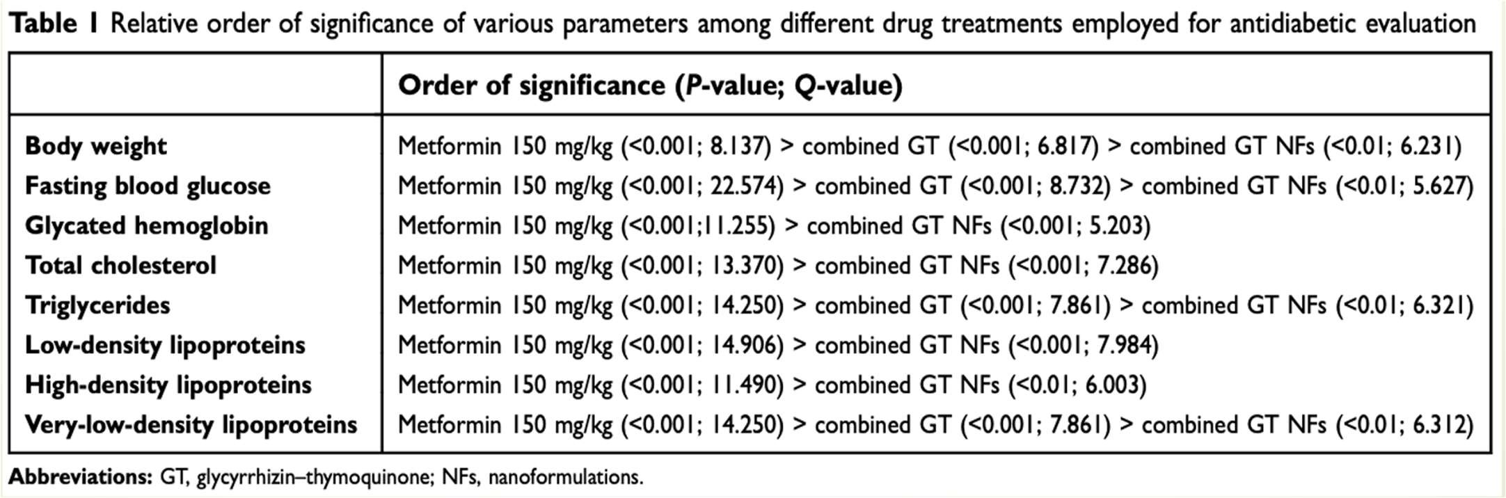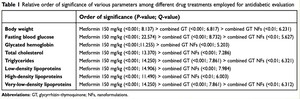 Combined GT NF showed significant results in all eight parameters which were body weight, BGL, TG level, VLDL, HbA1c levels, TC, LDL, and HDL.4 These results are obtained when you compare them against the pure individual forms. As shown in Figure 8, the combined GT NF was not as effective as Metformin showing that it’s not a better, but a lower-dose alternative to treating diabetes mellitus.4