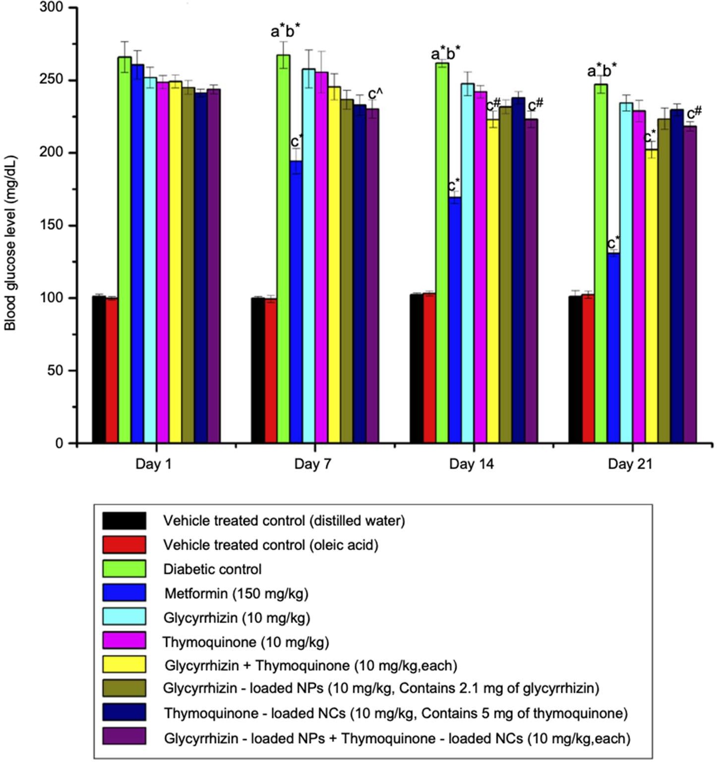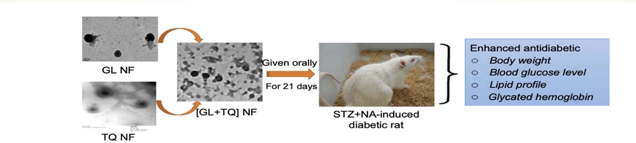 6-week-old BALB/c and C57BL/6 female mice were implanted with either 4T1 or E0771 breast cancer cells.2 The survival was monitored daily from day 4 post-implantation until completion of the experiment, and tumor size was measured every 2-3 days.2 As shown in Figure 2, the Tranilast- Doxil combined NF had the longest tumor doubling time which means that the growth of the tumor was reduced.2 The Kaplan–Meier survival curves also indicate that the Tranilast-Doxil combined NF survived the longest compared to all other treated groups.2 The combined NF method was also useful in the treatment of diabetes mellitus. Rats were injected with nicotinamide and STZ for 21 successive days.4 A fasting BGL was measured using blood glucometer strips and >200 mg/dL was considered diabetic.4 The body weight of the rats was also measured after this treatment. Diabetes normally induces decreased body weight in individuals with the disease.1 As shown in Figure 3, no significant effect on the body weight of diabetic rats was seen on days 1 and 7.4 Although, the body weight of diabetic control rats decreased significantly on days 14 and 21 compared to the vehicle-treated control groups of distilled water and oleic acid.4 The body weight of metformin, combined pure GT, and combined GT NF significantly showed an increase in body weight on days 14 and 21 reversing the diabetic symptoms.4 Oral administration of GL, TQ, and their NF forms had no effect on body weight on all days.4