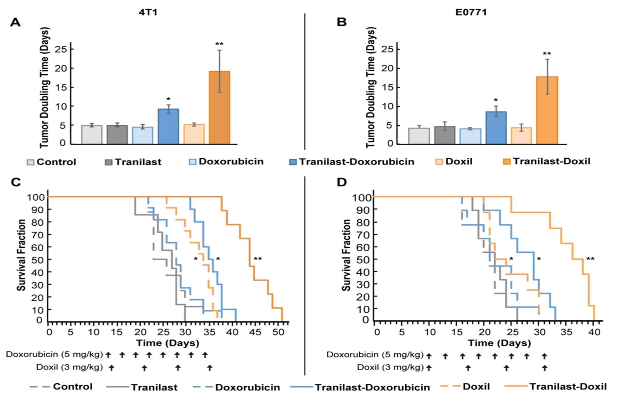 The researchers hypothesized that the combined LNPs of GT and Tranilast-Doxil will provide significantly better results than when the treatments are in their individual forms.2,4 They tested this by testing six groups for each disease with one of them being the combined LNP treatment. As shown in Figure 1, they tested the GT nanoformulation (NF) for 21 successive days and compared the results against metformin.4 Then, they evaluated the antihyperglycemic activity in streptozotocin (STZ) and nicotinamide (NA)-induced diabetic rats. STZ and NA are used to create experimental diabetes in rats that allow them to control the level at which the rats have the disease.4 They also employed two TNBC syngeneic mouse models (4T1 and E0771) and had six treated groups with Tranilast-Doxil being the combined NF treatment.2 The six treated groups for the TNBC were administered through different routes with the individual forms of Tranilast being orally for 4 days, doxorubicin intraperitoneally every 3 days, and Doxil intravenously weekly.2 The combined forms of Tranilast-doxorubicin and Tranilast-Doxil were until the time of death or reached a maximum tumor burden of 1200mm3.2 Then, they evaluated animal survival, tumor growth size, normalization of the TME, and anti-tumor immunity in the mouse models.2