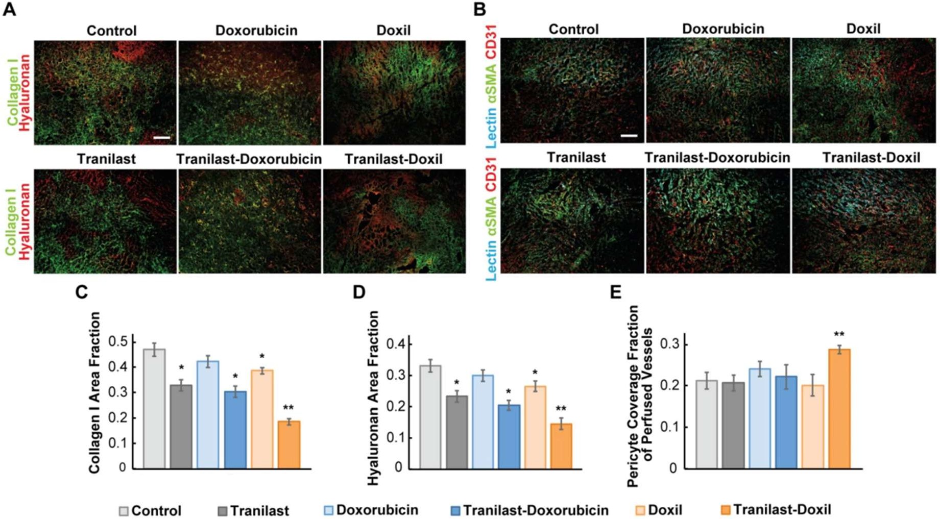 Alteration within the TME of TNBC was tested using a second experiment with the same previous conditions as discussed in Figure 2.2 Collagen I, Hyaluronan, and Pericyte coverage were tested as they are the extracellular matrix (ECM) components of a blood vessel.2,7 The rats were intracardially injected with biotinylated Lycopersicon esculentum lectin (Tomato Lectin).2 The pericyte coverage of functional vessels was determined as the ratio of lectin, aSMA, and CD31 positive staining to the total CD31 area fraction.2 As shown in Figure 4, the fluorescence imaging and graphs show that Tranilast-Doxil combination NF has less Collagen I and Hyaluronan while having more pericyte coverage.2 This means that fewer ECM components are clogging up the space allowing for more fluid flow.7 Also, more pericyte coverage means that there is less leakage occurring in the blood vessels.2