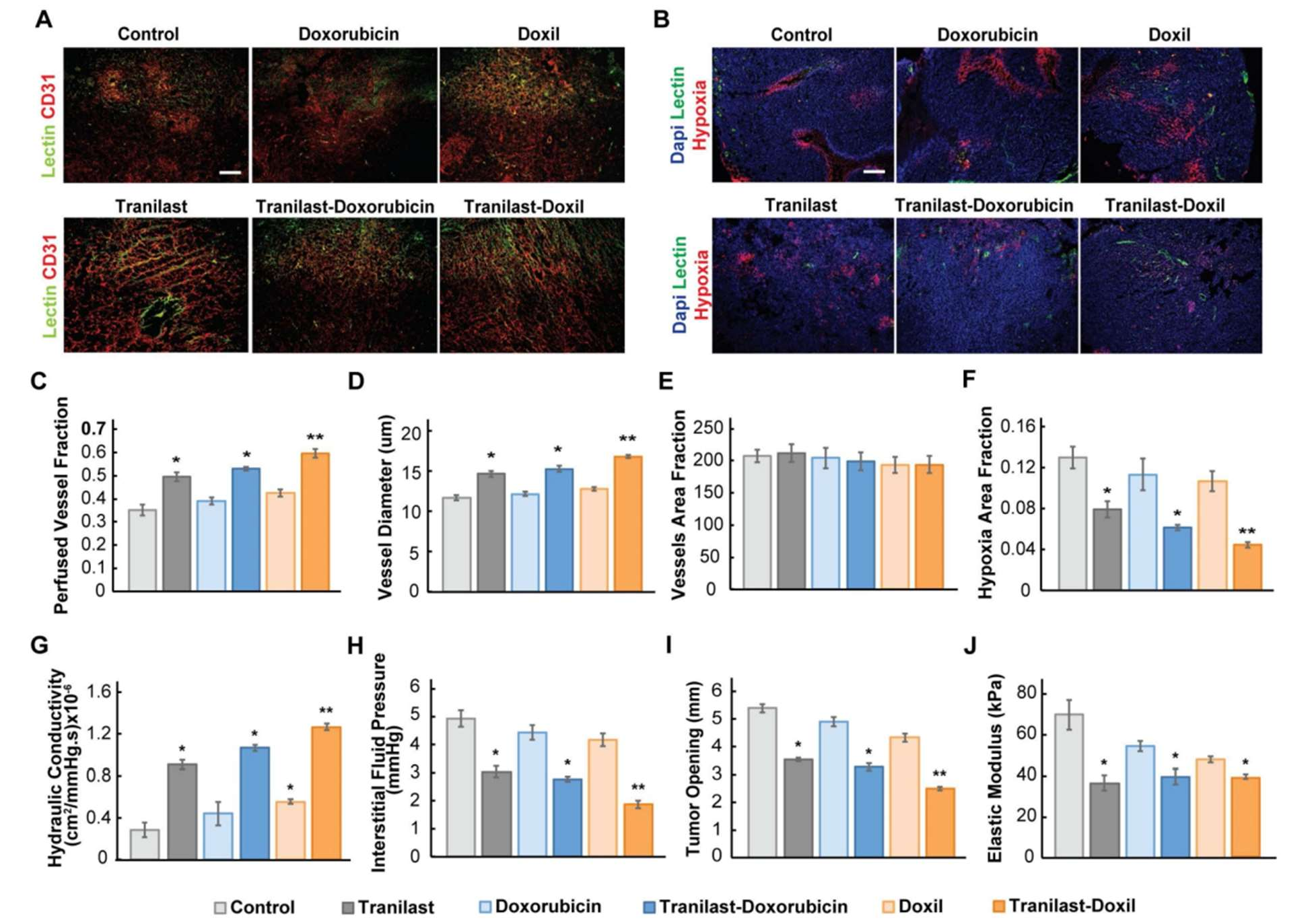 Further alterations within the TME were tested in various aspects. They used rats that were intraperitoneally injected with pimonidazole HCl which is a hypoxia marker.2 Hypoxia is a low oxygen state where oxygen is not able to be delivered to the tissues.8 Hydraulic conductivity is the easiness by which interstitial fluid percolates in tumor ECM and was tested ex-vivo.2 This means that the treatment was performed in an external natural environment.8 The elastic modulus was tested which measures the stiffness and DAPI were used to stain the nuclei present.2 Interstitial fluid pressure (IFP) was determined by a wick-in-needle method and growth-induced solid stress was measured using the tumor opening technique.2 As shown in Figure 5, the Tranilast-Doxil group had more pericyte coverage and less hypoxia while the amount of nuclei present was the same.2 It had the largest amount of blood flow and diameter compared to the other groups. It also had the most hydraulic conductivity with the smallest amount of pressure and stiffness.