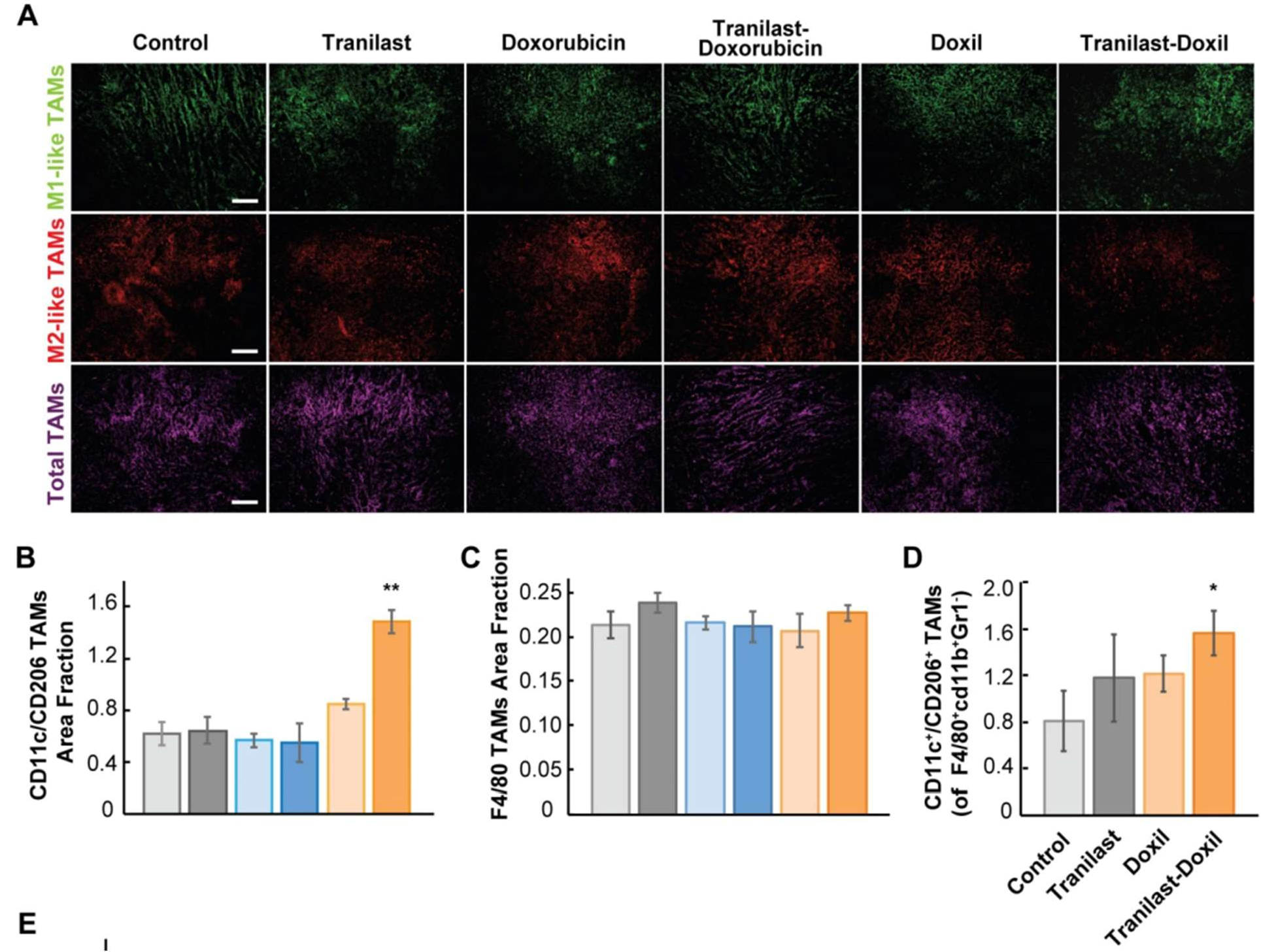 Tumor-associated Macrophages (TAM) were measured by staining antibodies against CD11c and CD206 proteins expressed in M1- and M2-like TAMs, respectively.2 M1-like TAMs are immunosupportive while M2-like TAMs are immunosuppressive.9 The total macrophage population was calculated from the F4/80 fraction and remained unaffected.2 As shown in Figure 7, the Tranilast-Doxil combination redirects the M2-like phenotype towards the M1-like due to more functional vasculature and tumor tissue oxygenation.2 This indicated how the combined Tranilast-Doxil NF helps the immune system in the TME of TNBC.