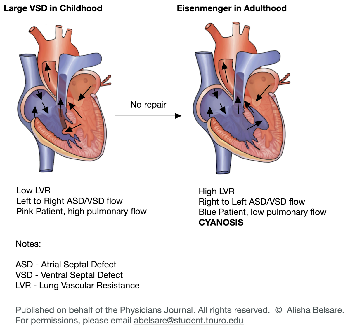 Eisenmenger syndrome is a long-term complication from congenital heart malformations that involves three key defining features: 1) Systemic-to-pulmonary cardiovascular communication (VSD or ASD), 2) Pulmonary arterial disease, and 3) Cyanosis. Due to a ventral septal defect (VSD), the patient presents with a left-to-right shunt. As blood flows from left to right, the patient experiences increased pulmonary artery pressure, leading to elevated pressure in the pulmonary arterial bed within the lungs. This heightened pressure causes endothelial damage and hyperplasia in the lungs. Eventually, as a result of these changes, the pressure on the right side of the heart becomes sufficiently elevated to surpass the pressure on the left side, creating a right-to-left shunt that leads to cyanosis1 (figure 1).
