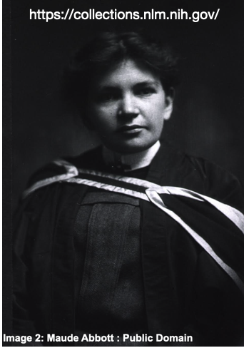 Maude Abbott (Image 2) was one of the first female physicians in Canada. She left her mark on medicine as a pioneer in congenital heart anomalies and published over 102 research papers, an enormous feat at that time.5 She was born in 1869 in St. Andrews, a town 40 miles away from Montreal. She was part of the first undergraduate class that accepted women in McGill University. While she wanted to pursue medicine at McGill, the faculty were adamant of not accepting a woman. She was able to attend a medical school affiliated with the University of Bishop’s College. After graduating with numerous honors, she sailed to Europe to learn from medical centers to learn about pathology.